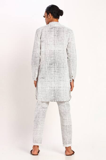 White linen straight short kurta with concealed placket & all-over chevron motif print. Comes with pants.