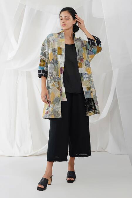 Grey 100%linen Kantha, Patchwork Shawl Collar Reversible Jacket