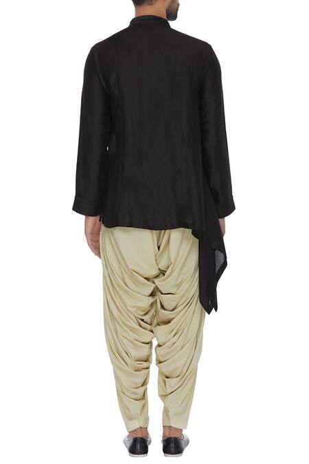 A stylish black kurta made from lustrous linen satin fabric, accentuating asymmetric hem with side drape & slit pocket.
