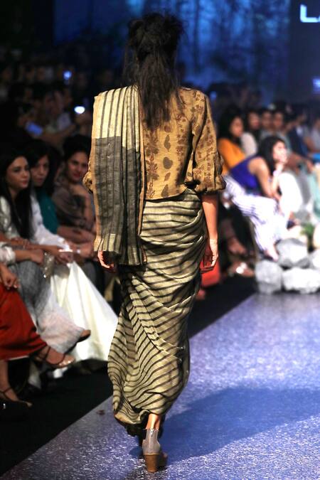Buy_Anavila_Green Linen Stripe Printed Saree_at_Aza_Fashions