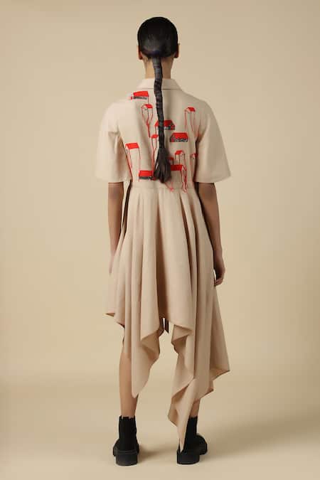 Buy_Shahin Mannan_Beige Linen Embroidery Shawl Neck Tiny Houses Asymmetric Dress _Online_at_Aza_Fashions