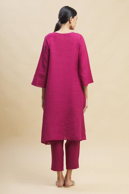 Fuschia tunic with placement floral embroidered motif & asymmetric button placket.