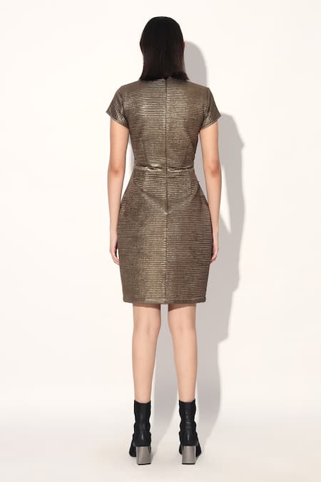 Gold quilted crepe dress featuring a round neckline and cap sleeves