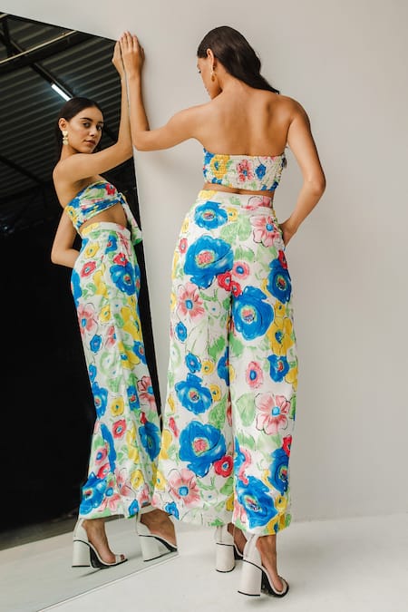 Multi colored satin bandeau with floral prints & front tie-up. Paired with high waisted pant.