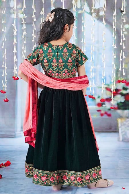Green Silk, Velvet, Viscose Embroidery, Bageecha Floral Thread Work Lehenga Set