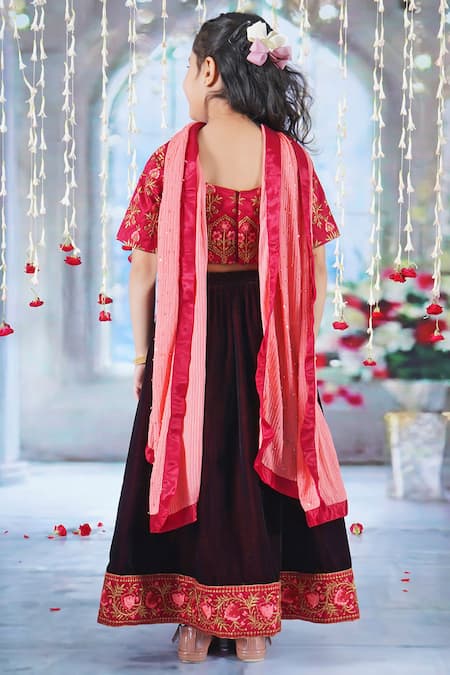 Red Silk, Velvet, Viscose Embroidery, Bageecha Thread Blouse Lehenga Set