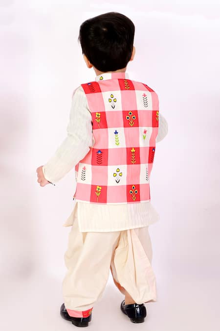 Red jacket with printed checks and floral motifs. Paired with a striped beige kurta and draped pant featuring a printed dhoti hem.
