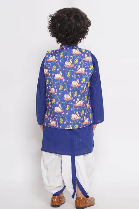 Blue kurta featuring a round neckline and full sleeves. Paired with a peach cotton nehru jacket adorned with cow print and a dhoti pant.