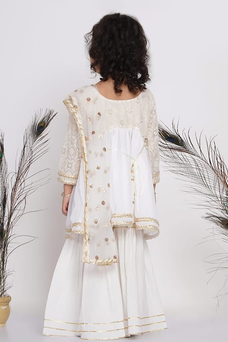 White kurta featuring floral embroidery on the bodice with a round neckline and full sleeves. Paired with a tiered sharara and a sequin embroidered sheer dupatta.