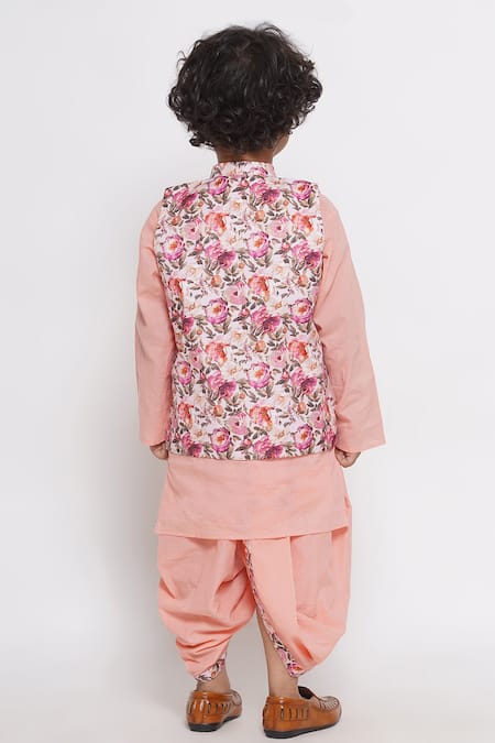 Peach kurta featuring a round neckline and full sleeves. Paired with a floral printed Nehru jacket and dhoti pant, both made from cotton.