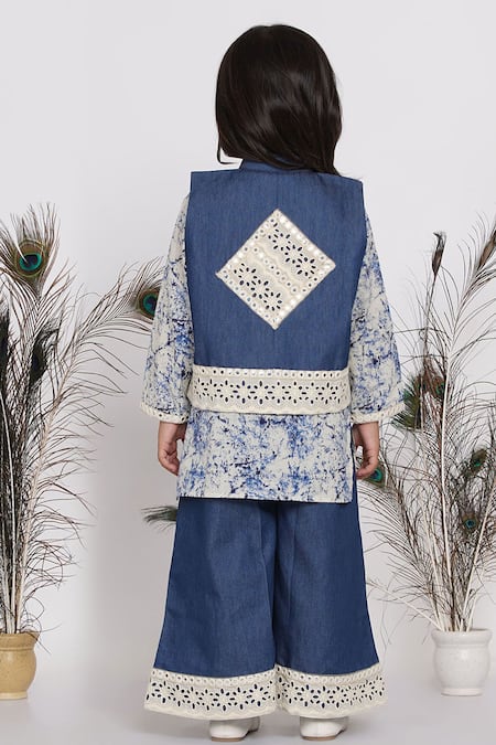 Blue kurta set featuring a lace embroidered hem jacket with fabric buttons. Paired with a marble print kurta and lace hem palazzo.