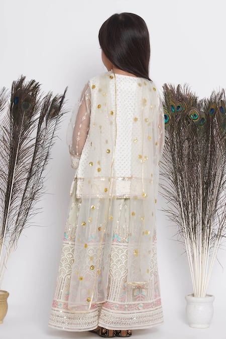 Cream kurta featuring a round neckline and sheer sleeves. Paired with an olive embroidered lehenga and a net dupatta adorned with gota lace borders and sequin embellishments.