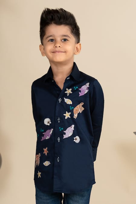 Navy blue shirt featuring resham embroidery in an animal placement pattern