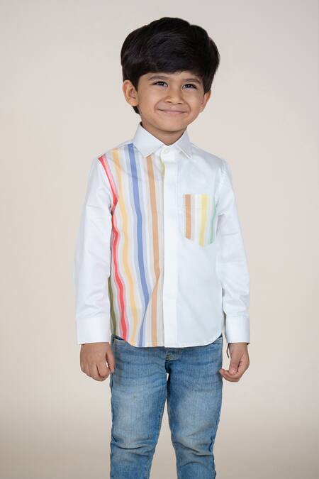 White cotton satin shirt featuring a multi-colored striped panel on the front