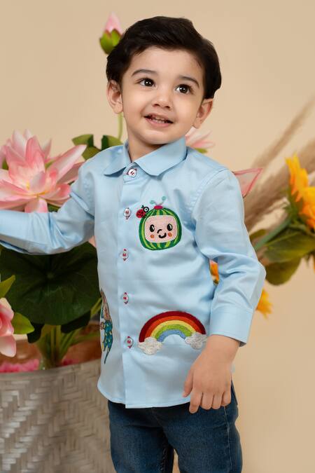 Blue button down shirt featuring Cocomelon theme embroidery details