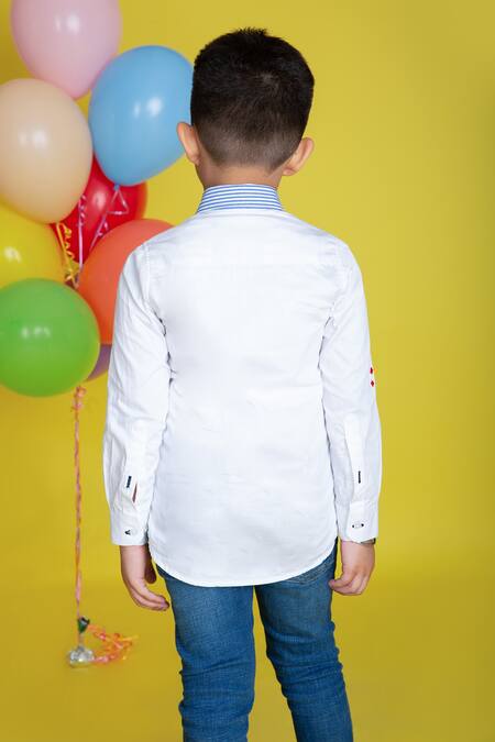 White shirt featuring an embroidered teddy bear motif and striped spread collar