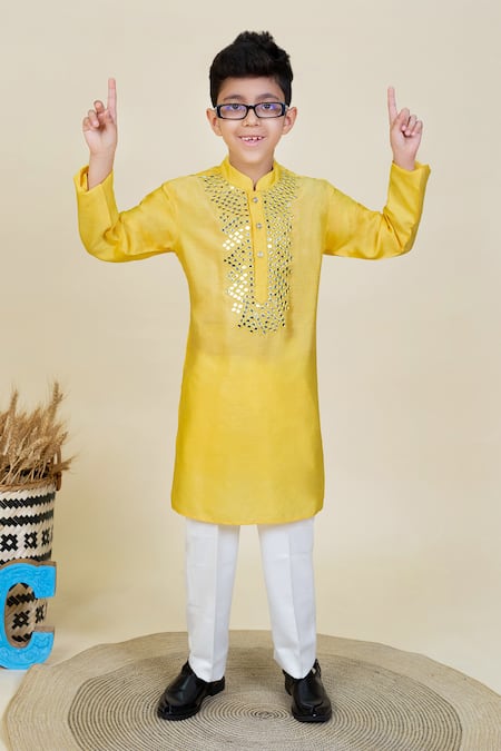 Yellow kurta featuring mirror work embroidery around the lapel. Paired with an off-white cotton silk pyjama.