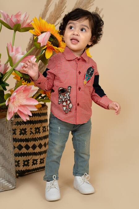 Red Cotton Satin Embroidery Glen Checkered Space Theme Shirt