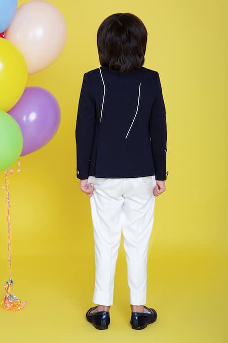 Blue blazer featuring white stripes, flap pockets, and a collar. Paired with straight pants for a complete look.