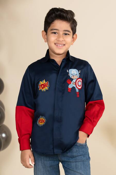 Navy blue and red color block shirt featuring superhero inspired thread embroidery
