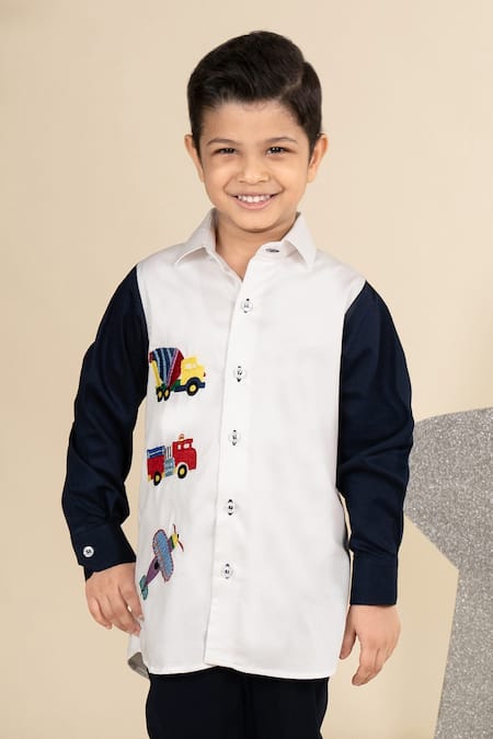 White shirt featuring resham embroidery in a transport pattern