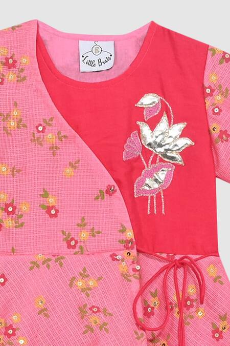 Pink floral printed asymmetrical kota dress featuring hand sequins and gota embroidery