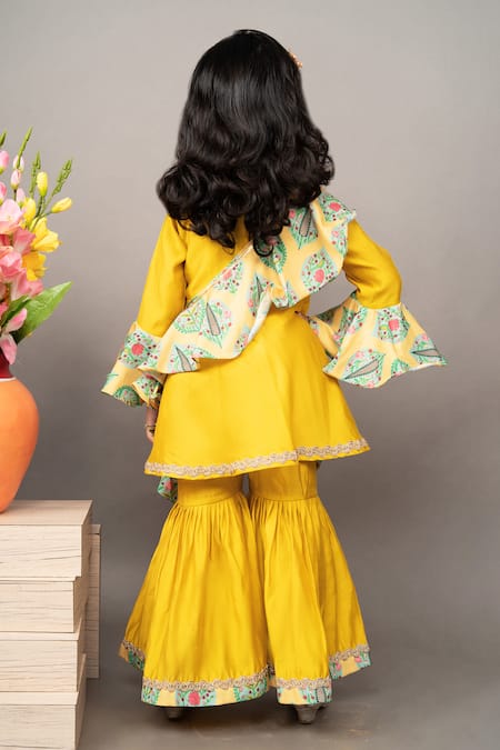 Mustard yellow kurta featuring floral print and zardosi hand embroidery. Paired with a matching sharara and dupatta.