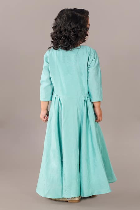 Aqua green anarkali featuring sequin and thread embroidery in a floral pattern. Paired with a matching pyjama, it has an asymmetric hemline for added style.