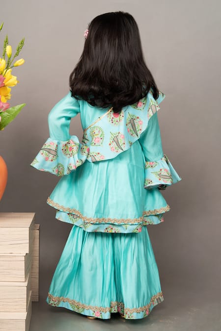 Aqua blue kurta featuring bell sleeves, round neckline, and floral print with zardosi hand embroidery. Paired with a matching sharara and dupatta.