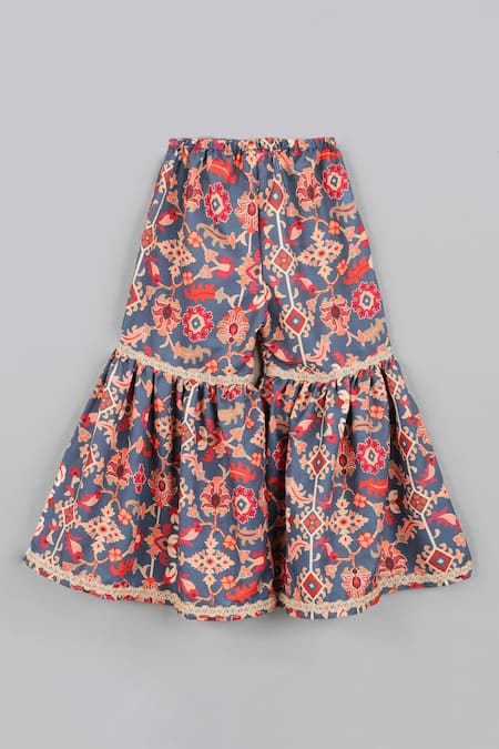 Lace embroidered bodice on kurta, Floral vine prints, Elasticated waistband on sharara