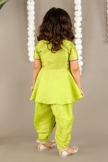 Parrot green peplum top featuring bird cord embroidery on the front and purple piping on the collar and sleeves. Paired with dhoti pant bottom adorned with lace detailing.