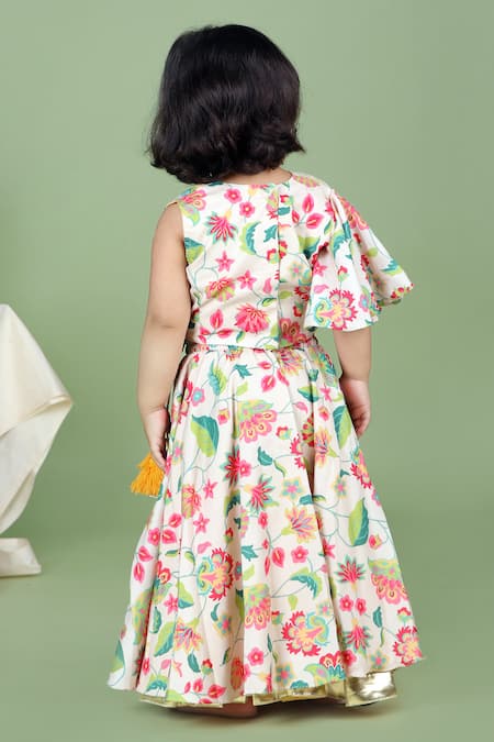 White lehenga featuring all-over digital floral prints and tassel details. Paired with a round neck blouse with one-sided ruffle sleeve and hand-embroidered placket.