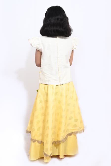 Yellow layered lehenga featuring foil printed motifs and scallop border. Paired with a printed, embroidered top with frill sleeves and a round neckline.