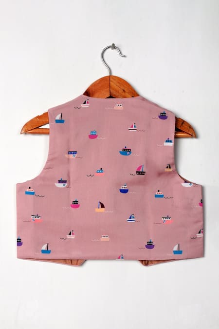 Buy_Little Brats_Pink Cotton, Kota Doria Ship Print Waistcoat _at_Aza_Fashions