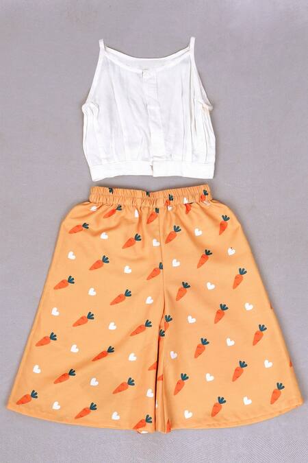 Beige spaghetti top featuring pearl hand embroidery and cutwork lace at the armhole. Paired with a carrot printed palazzo with an elasticated waistband.
