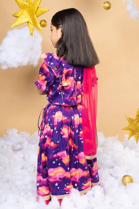Purple lehenga featuring drifting clouds and shooting stars print, embellished with lace and moon stuffed tassels. Paired with a matching puffed sleeves frilly blouse and a soft tulle dupatta.