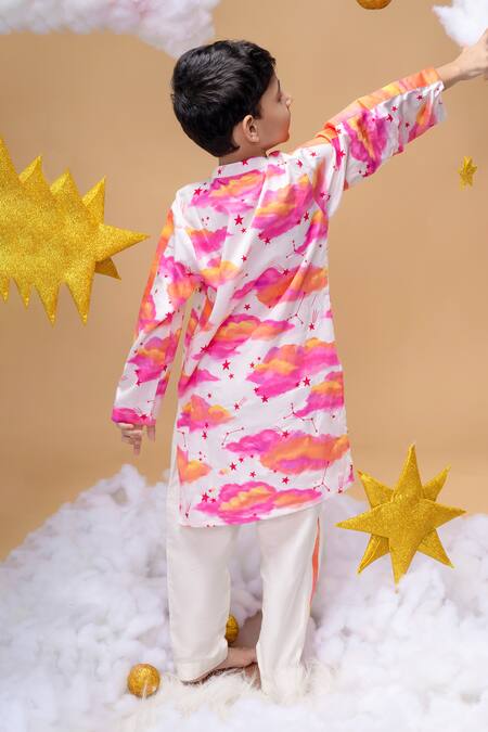 Off white kurta featuring a mandarin collar and long sleeves, adorned with embroidered stars on a print of clouds. Paired with matching pants that have a side band detail.