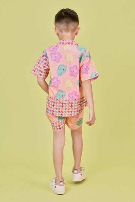 Coral shirt featuring a floral blossom print and a lapel collar. Paired with matching shorts showcasing a vibrant design.