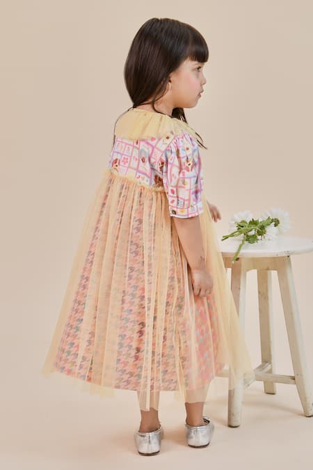 Pink Cotton Satin, Tulle Chantelle Cute Motif And Houndstooth Print Dress