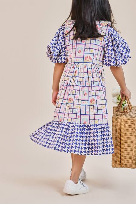 Blue dress featuring houndstooth and toy prints with a Peter Pan collar