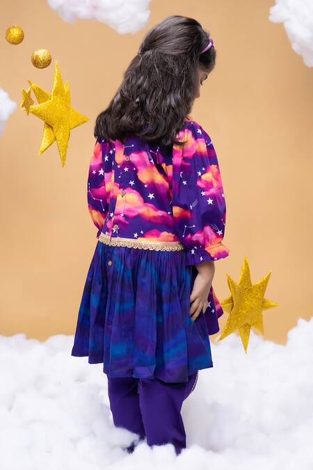 Purple kurta featuring puffed three fourth sleeves, round neckline, and an all-over clouds and shooting stars print. Paired with a lace embellished dhoti pant.