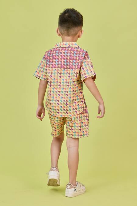 Green and brown houndstooth printed shirt featuring a lapel collar and half sleeves. Paired with matching shorts that have an elasticated waistband.