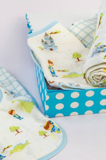 White printed organic muslin essentials gift set featuring a pair of swaddles, bibs, and burp cloths. Includes a snugly 3D castle pillow with a checkered pattern.