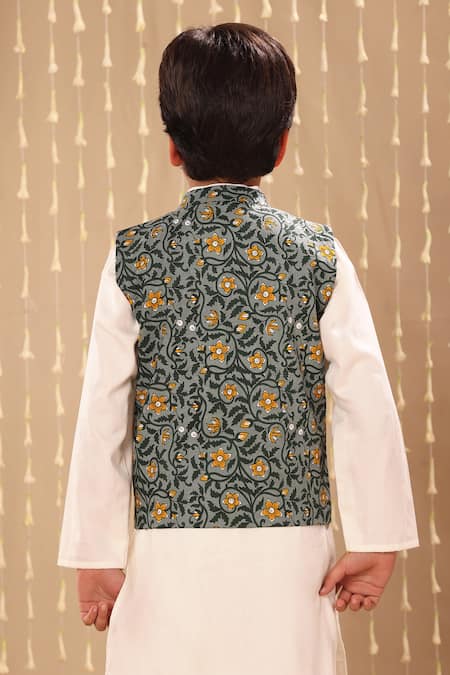 Grey floral handblock printed bundi with mandarin collar. Paired with a solid kurta and pant featuring a straight silhouette and welt pockets.