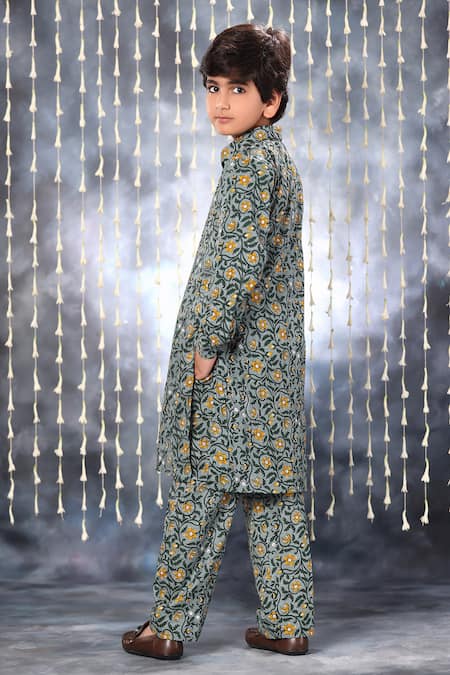 Grey kurta featuring an all-over floral jaal print with a shirt collar and full sleeves. Paired with matching pant in handblock pattern.