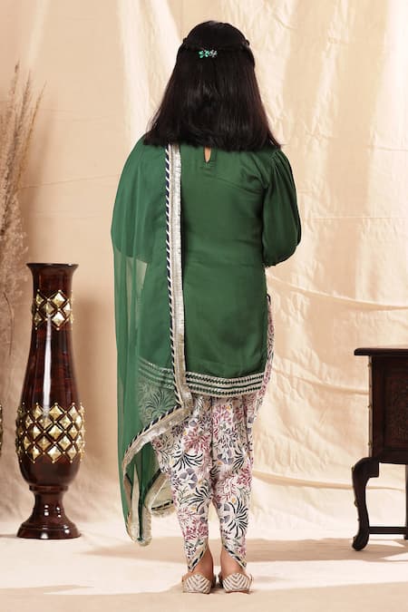 Green straight kurta featuring a round neckline and three-quarter sleeves. Paired with floral printed dhoti pants and a chiffon dupatta with gota patti borders.