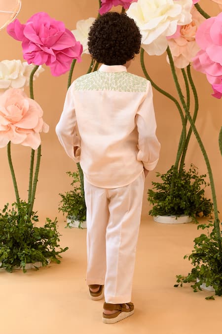 Peach shirt featuring tree embroidery on the neckline and cuff sleeves