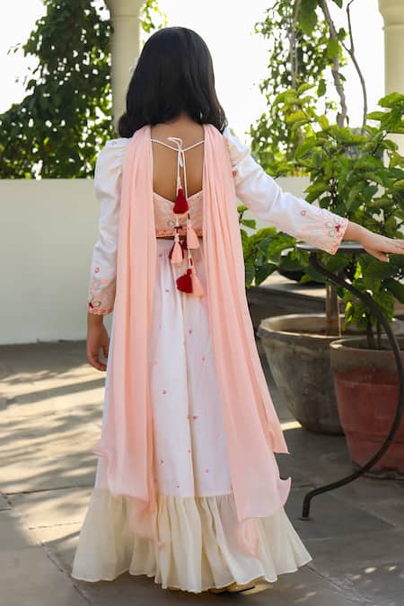 White and peach embroidered sharara set featuring a round neckline and three-quarter sleeves. Paired with a dupatta and a blouse with side zip closure and back tassel tie-up detail.