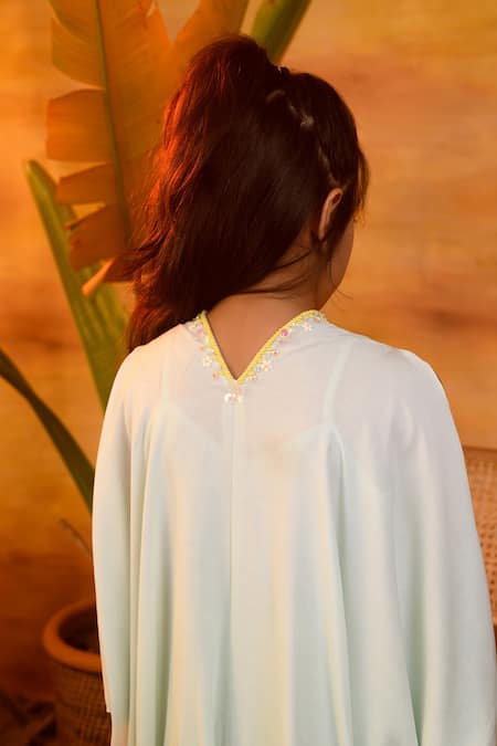 Aqua glass kaftan featuring bead embellishment on the neckline and waistband. Paired with a coordinating inner for added comfort.