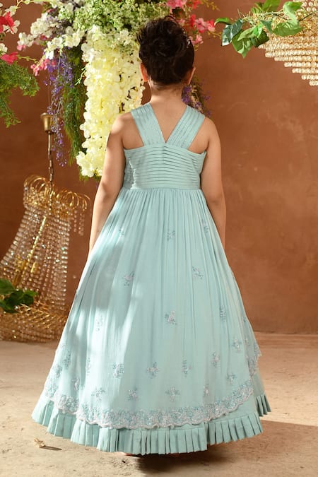 Celestial blue gown featuring a V collar neck and sleeveless design